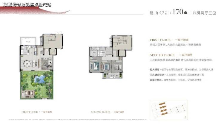 比如建面约170㎡的双层下叠四房两厅三卫,约9.7米面宽,三开间朝南的大四房格局。约6.9米面宽,两房朝南;南向房间一字拉平,北向也设置房间,但确保每一层空间,与院落、阳台或露台衔接,迎接漫天漫地的阳光与月光。