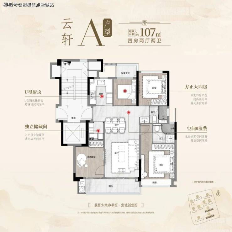 户型107-174m²。最小107m²,竟然做成大四房+储藏间的格局,精装标准也相当高,居住舒适度拉满。