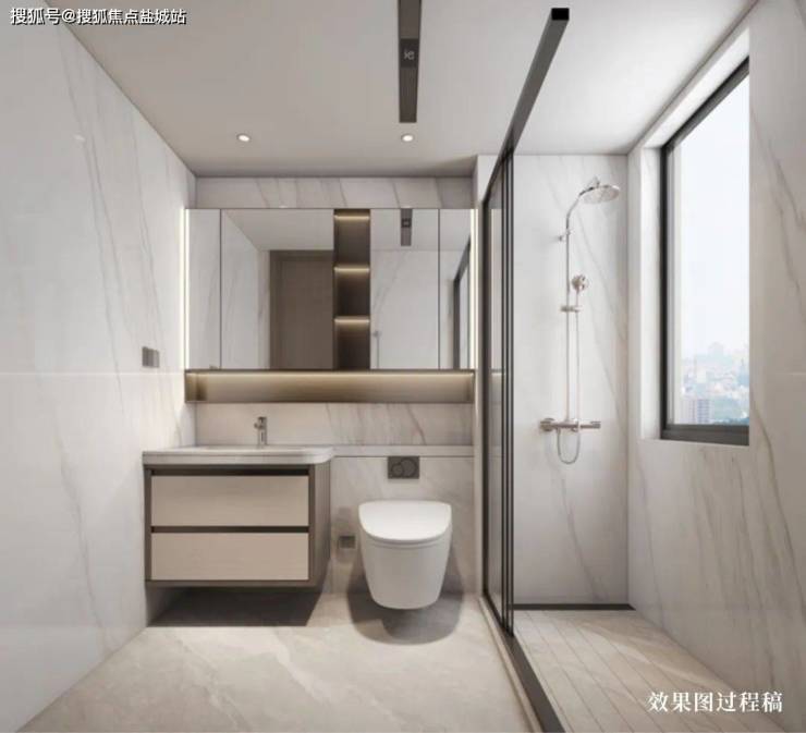 主卫配科勒酒店式壁挂智能马桶,淋浴是汉斯格雅+顶喷喷头,卫生间干区还配电地暖。