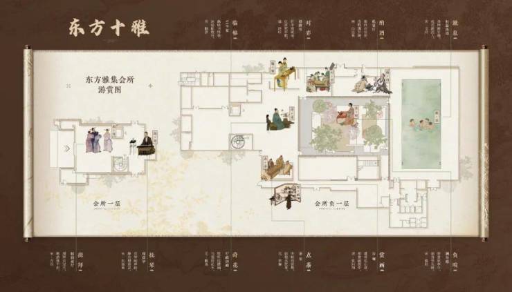 会所建面约2000㎡,一层设有接待前厅、观赏亭,负一层设有行政酒廊、茶室、健身房、私宴厅、恒温泳池等功能空间,师法千年前的西园雅集之道,在琴棋书画、诗酒花茶之间,传承骨子里的东方雅致生活方式