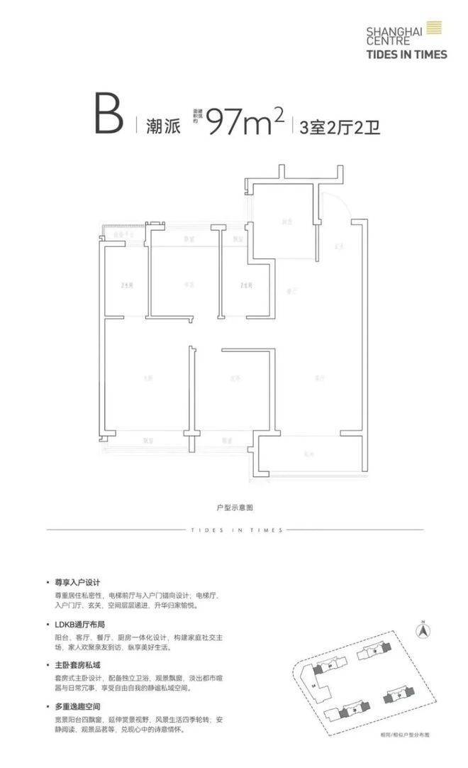 建面约95-97㎡3房2卫,户型3开间朝南+T字动线+动静分离,主卧也设计了套房,让室内采光、通风、私密性都做了进一步升级。
