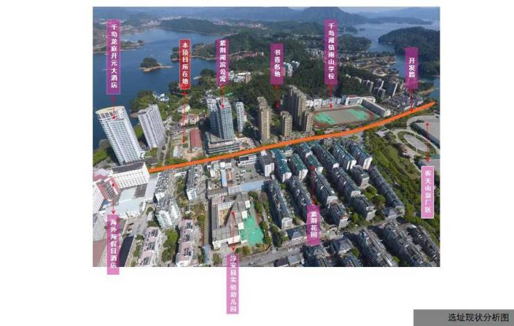 该项目位于杭州市淳安县千岛湖镇开发路66号,南山区块,北侧为杭州千岛龙庭开元大酒店,西侧为开发路,南侧为紫荆湖滨酒店及公寓,东侧为淳安县老年公寓,地块总用地面积为7620.8㎡