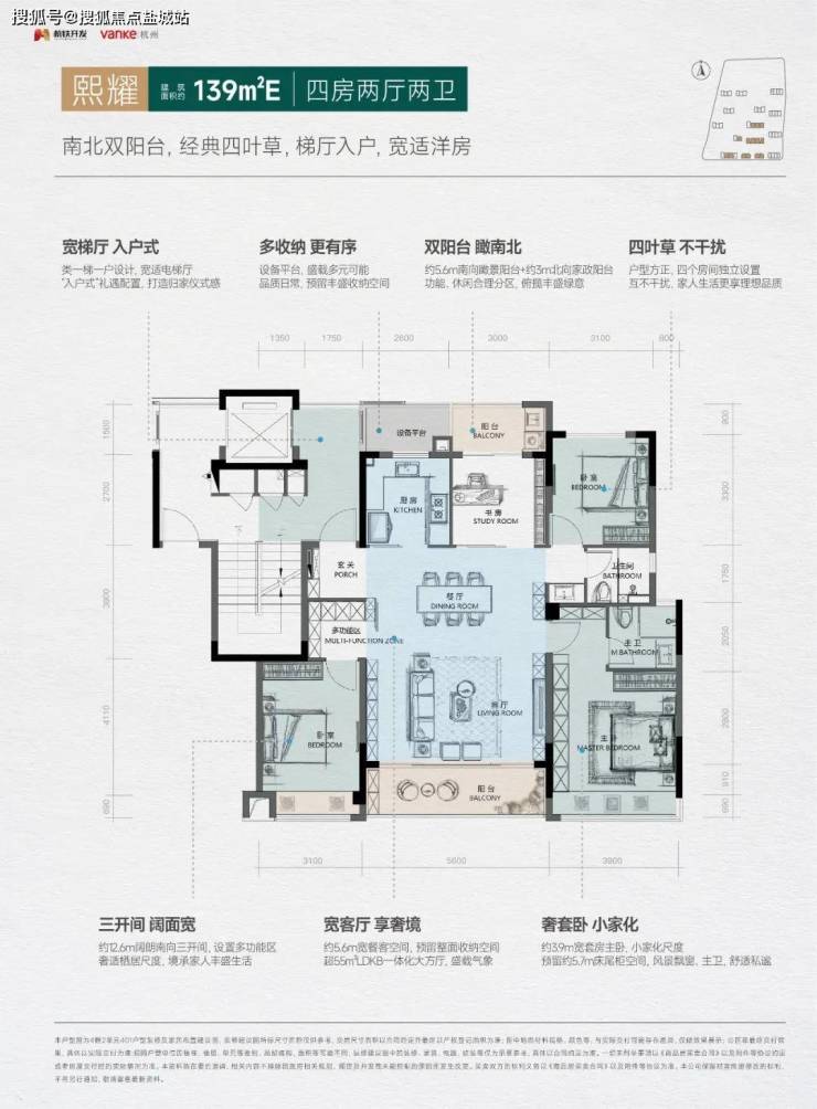 改善家庭可以选择建面约139㎡户型“一步到位”,该户型更加接近传统“四叶草”格局,整体为双套房设计。