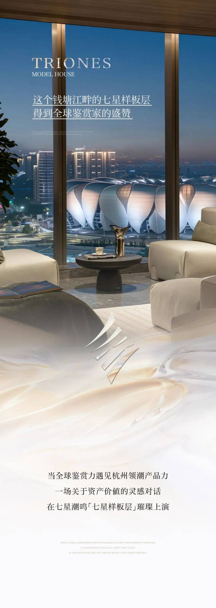 同频迪拜LANA酒店的都会静谧体验,与东京麻布台安缦公馆综合体大平层审美共鸣,七星潮鸣「七星样板层」向世界递出一张代言杭州的美学名片。