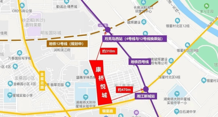 项目拥有“三横三纵三桥”的城市交通网。三横指普瑞大道,月亮岛路,银星路;三纵指金星路,银杉路,潇湘大道。三桥是指月亮岛湘江大桥、三汊矶大桥、福元路大桥。地铁4号线湘江新城站约470米,地铁12号线(规划中)与地铁4号线在月亮岛西站实现无缝换乘,距离项目仅310米。