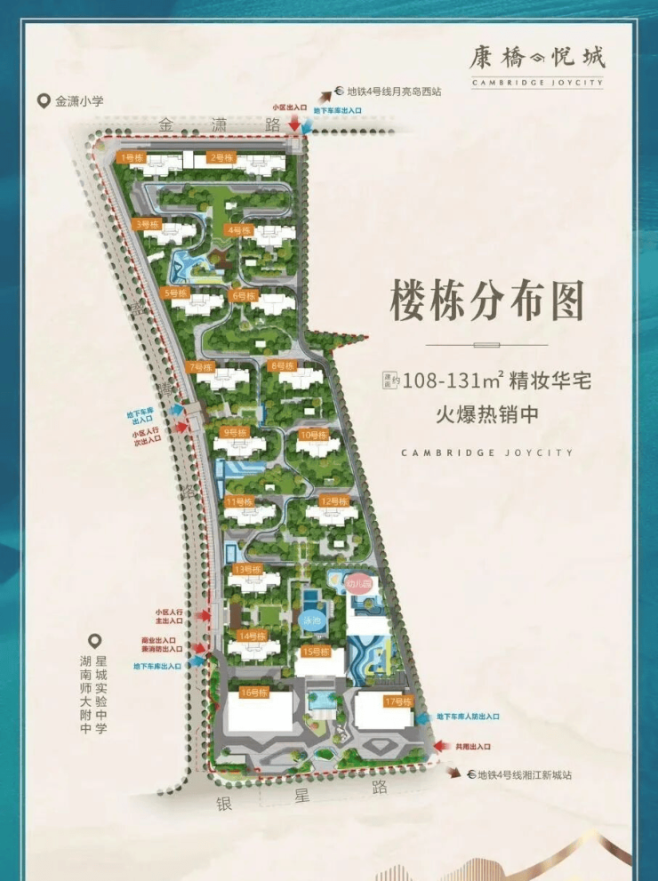 项目自带9个班幼儿园,湖南师大附中星城实验中学与项目仅一街之隔;项目北边约110m就是金潇小学,共54个班;同时区域3公里内还有长郡月亮岛小学和长郡月亮岛学校第三小学等(注:学区划分以教育部门文件为准)