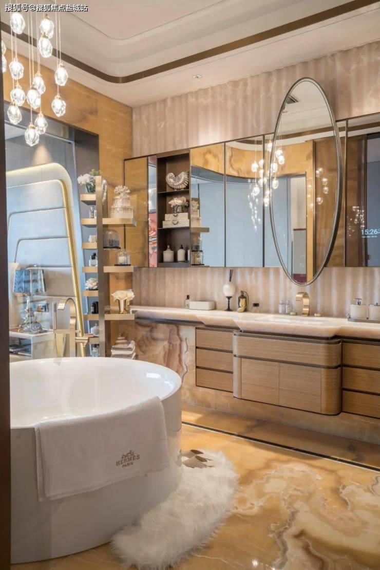 非线性的曲线造型透光玉石墙面,流线型的主卫台盆,奢华波浪,倩影流转,仿佛窗帘轻拂,玉影如流水倾泻,玉润光华,映照岁月轻叹。现今社会安全密室已经成为成功人士居家生活的一部分。主卧室的意大利Agresti安全密室,是用户的私人艺术中心,房子的心脏,更是最安全的堡垒。