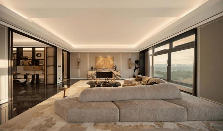 梁志天&上海世尊共同执笔:410㎡湾潮户型:WSD上海世尊团队执笔,以独一无二的“摩登东方”设计语言,抽象提取东方写意精神,与复古摩登、自由艺术平衡相融,领潮钱湾黄金时代。