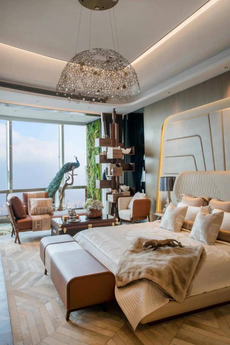 非线性的曲线造型透光玉石墙面,流线型的主卫台盆,奢华波浪,倩影流转,仿佛窗帘轻拂,玉影如流水倾泻,玉润光华,映照岁月轻叹。现今社会安全密室已经成为成功人士居家生活的一部分。主卧室的意大利Agresti安全密室,是用户的私人艺术中心,房子的心脏,更是最安全的堡垒。