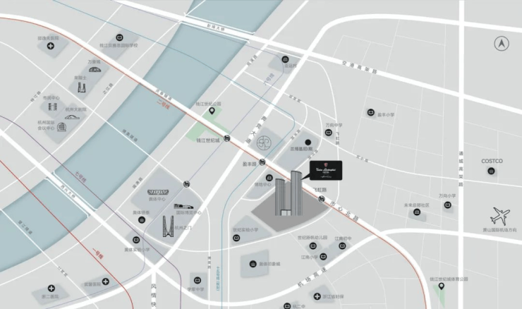 钱江世纪城奔竞大道的战略地位,堪比纽约第五大道与巴黎香榭丽舍的叠加态。项目与SKP直线500米的黄金距离,构建起"步行5分钟即达亚洲店王"的消费霸权,而亚运"莲花碗"与杭州之门形成的270°江景视野,则复刻了香港维多利亚港的景观溢价模型。地铁2号线上盖的交通优势,使得15分钟直达萧山机场的效率,足以对标伦敦金丝雀码头的商务能级。
