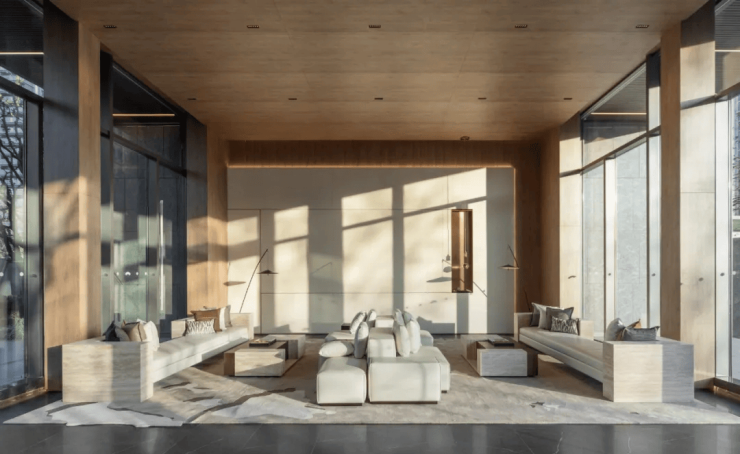 站在东面的小区主入口,首先映入眼帘的就是精致的圆形水景,让人仿佛置身于高端酒店,回家的仪式感被拉满。