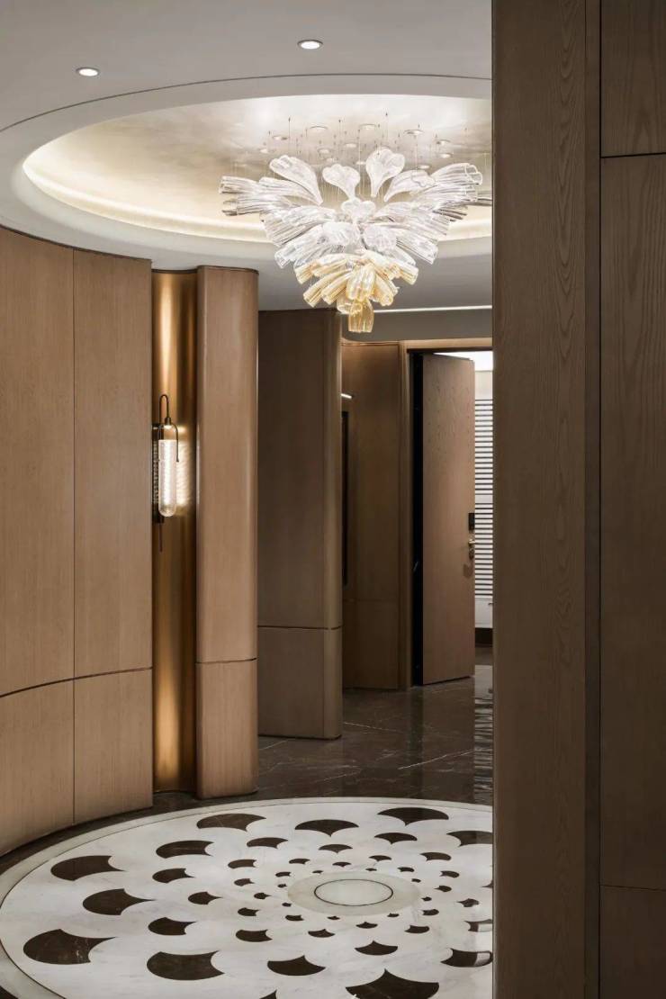圆形银箔天花与石材镶嵌发散银杏叶图案的地坪,上下呼应,垂吊的“花开富贵”艺术玻璃装置,在立面旋切工艺的影木映衬下,整个空间灵动且寓意美好:开枝散叶,财运亨通,如意呈祥扑面而来。