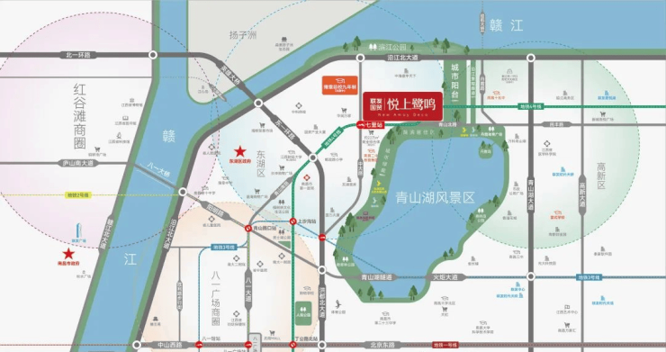 项目雄踞南昌城市地标--青山湖西岸,通江达湖近享难得城市自然风光,坐拥东湖区醇熟配套,畅享如旅城市度假生活。总建筑面积约9万平方米,规划落建的城市阳台将项目两面合围,北联约150万方滨江公园,南接约400公顷青山湖风景区,成就青山湖西全新生态人文旅游轴带
