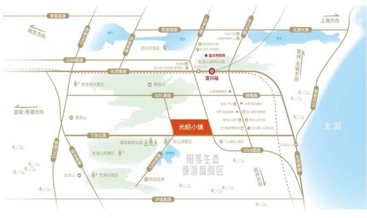 光明小镇地理位置优越,交通便捷,5分钟到达丁蜀宝龙商圈,10分钟车程就可以到达宜兴高铁站、G25 长深高速路口,20分钟左右即可到达宜兴市区;沪苏湖高铁预计2024年通车,未来一小时内能到达上海在内的多个长三角重要城市