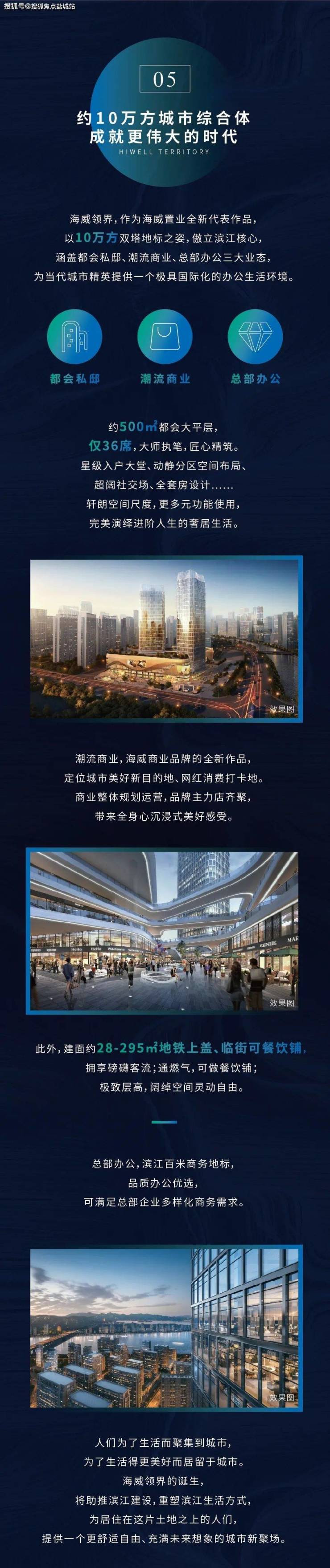 海威领界,作为海威置业全新代表作品,以10万方双塔地标之姿,傲立滨江核心,涵盖都会私邸、潮流商业、总部办公三大业态,为当代城市精英提供一个极具国际化的办公生活环境。