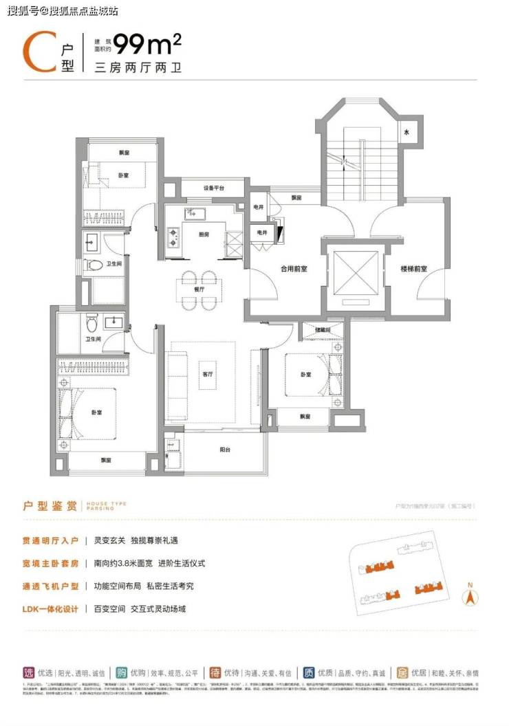 建面约99㎡3房2卫: