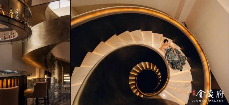 铜色金属感旋转楼梯梦回《繁花》,这样高格调的会所对标豪宅社区来看是有过之无不及!