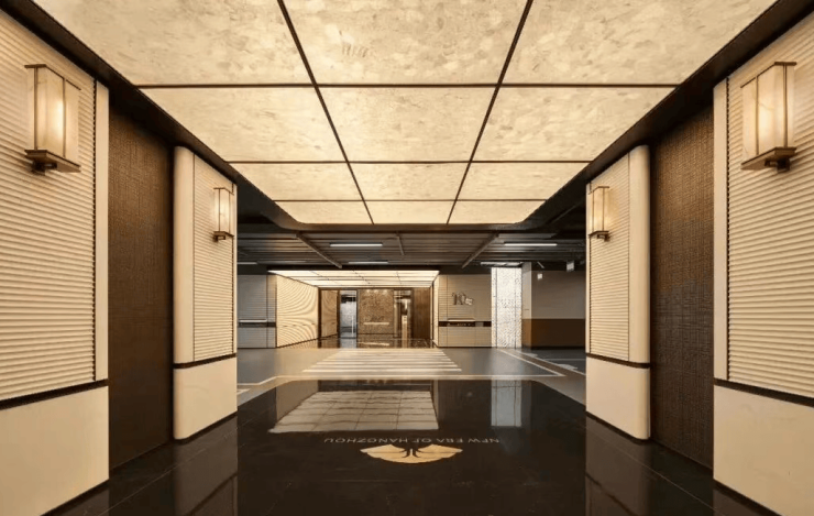 厅堂内大型水景艺术灯高悬于顶,以天为幕、气场大开,照映大理石地面,通体气派,传神东方宅邸的风骨。