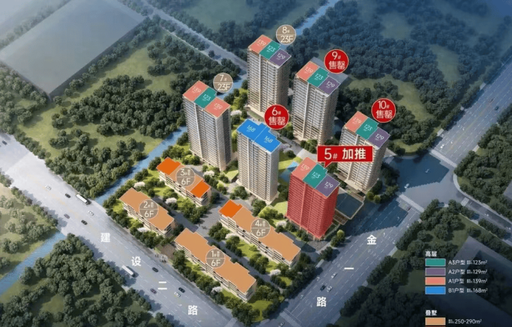 项目位于建设二路与金一路的交会处,依托方正的地形,规划了6幢高层+4幢叠排,其中高层住宅仅356套。户型方面,本次首开的2幢高层(9、10号楼),主推建面约123㎡的中间套,以及建面约129㎡、139㎡的边套,均为四房两厅两卫全明格局。
