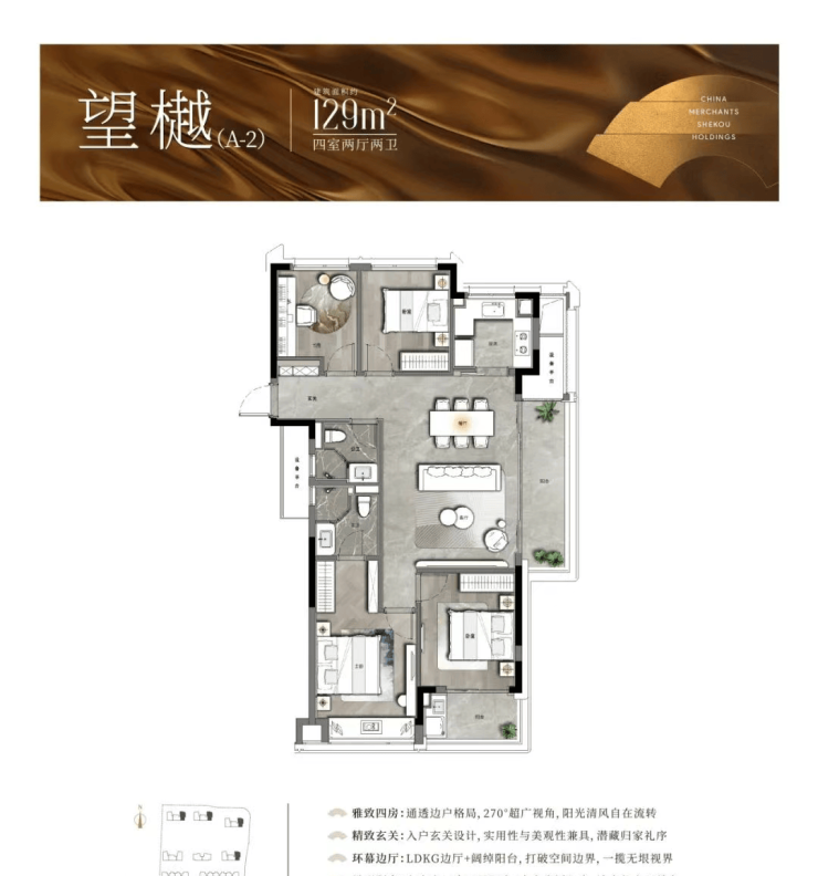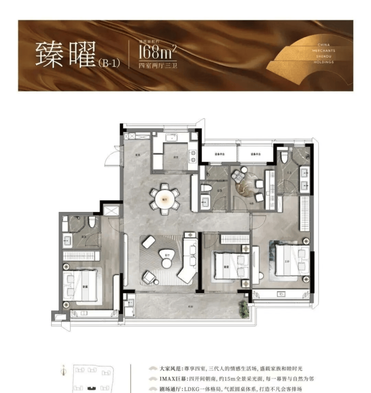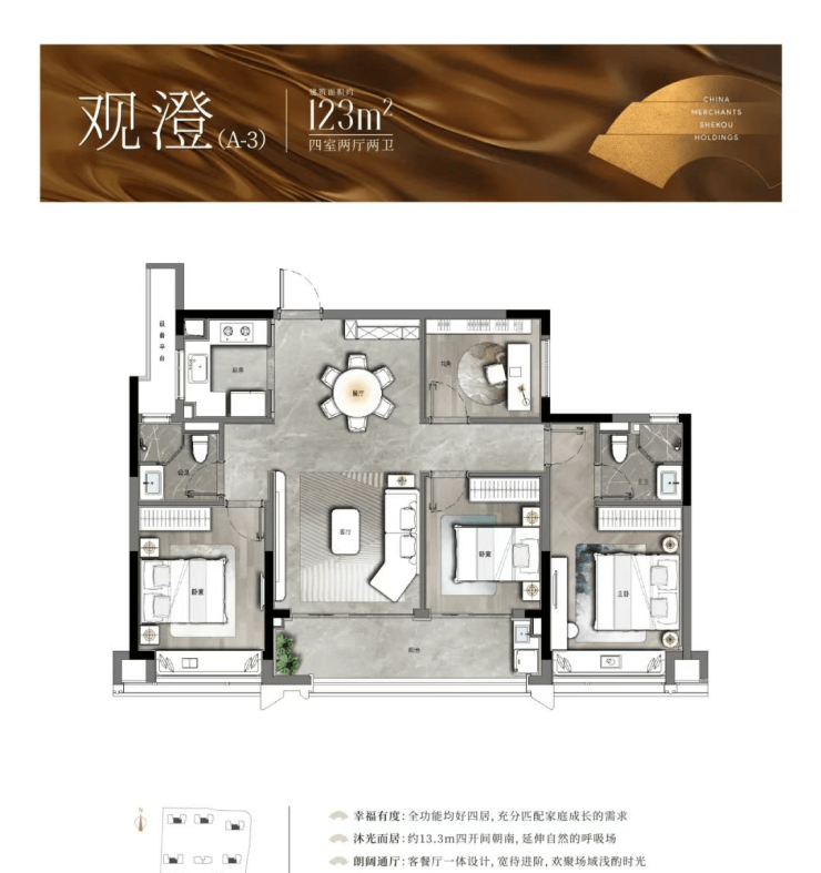 以中间套为例,建面约123㎡的户型做到了主次卧+客厅四开间朝南,伸展开约13.3米的超大面宽,对应双开间阳台与飘窗的设计,进一步提升了全屋的采光。此外,一体化的餐客厅,“一镜到底”活动空间,在视觉上拉大了户型的朗阔尺度。