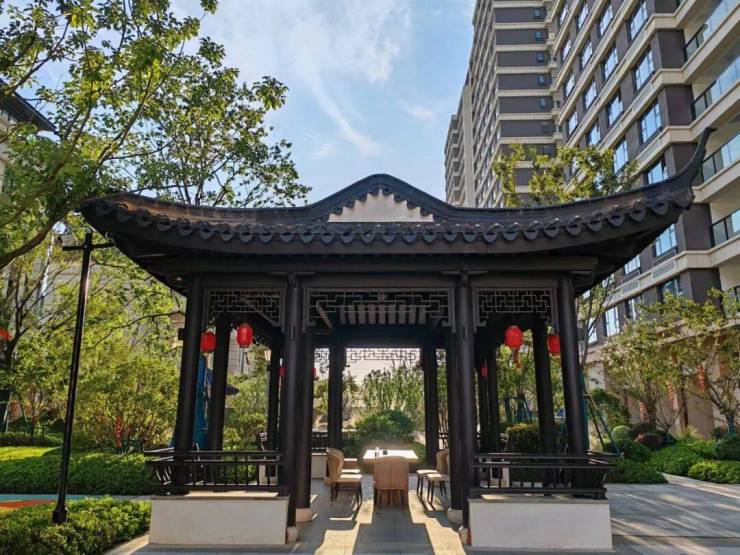 在桃溪院子项目内部,滴水瓦当、挂落、美人靠、六角亭、歇山亭、爬山廊等各种苏州园林传统建筑都完美复刻,让人如同置身江南水乡之中。