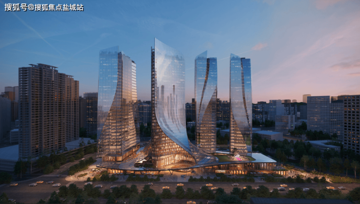 建筑群沿奔竞大道布局,由四栋塔楼及附属楼宇组成,其中T1、T2、T4为办公楼,T3为酒店,附属楼宇为酒店配套用房(商业)。建筑布局一大特色为酒店塔楼流转而下的天篷。天篷之上的塔楼挺拔向上、极具标志性;天篷之下的独立裙房错落有致,生趣盎然,呈现出有机的村落式空间形态。