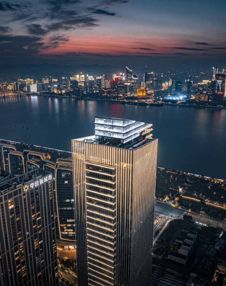 站在一览无余的玻璃窗向外望去,钱江新城的“日月同辉”与市民中心清晰可见,另一侧莲花碗、国博中心亦印刻眼前,一江两岸交相辉映,光芒闪耀。 这片黄金1.8公里江岸线,聚合着时代瞩目的恢弘地标,而IOC则占据着其中最为精华的0.54千米,成就整个奥体乃至杭州难以复刻的C位孤品。