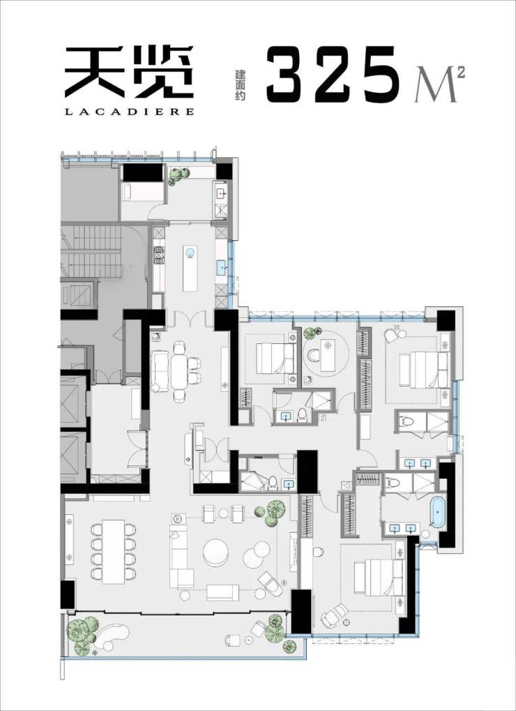 超级定位:大平层+别墅定位,平层户型起步面积325m²,高阶面积380m²,超奢一层一户650m²