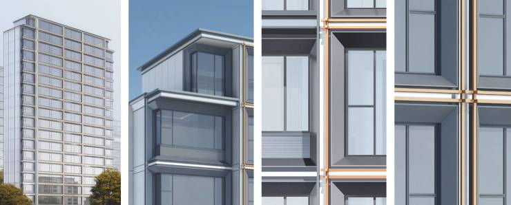 高级灰铝板、仿胡桃木色铝板、漫反射白玻、深灰色大理石材,多样化模块组合,打造低饱和度色彩与精致材料搭配
