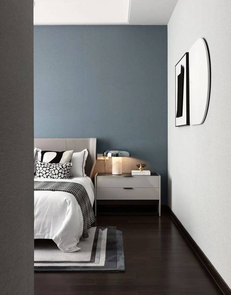 主卧重在表现安静的力量。相较于公共空间,主卧在延续黑白灰的基调之外,巧妙地加入了不同质感的蓝色,亚光面、皮革、木材以及布艺软装,温润的亲和感与自然气息在空间中糅合。