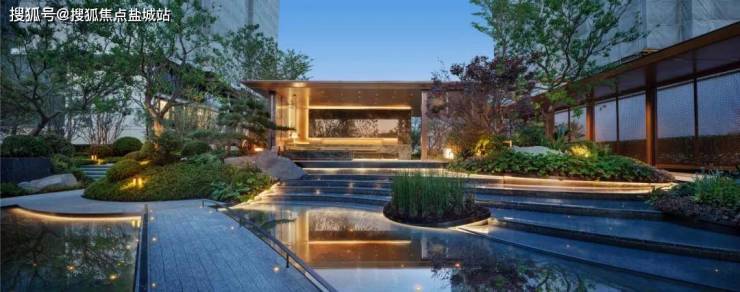 中岛水景,池底采用蓝钻花岗岩和阿尔卑斯灰仿石砖拼花定制星语言铺地,包括两边景墙立面选用高端的爱马仕灰奢石,彰显出顶级石材的大气典雅。包括景墙转角的弧面,工艺难度非常大。