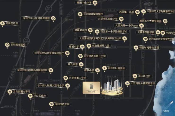 约5公里内多所学府环绕:五公里范围内涵盖大亚湾博雅培文实验学校、华中师范附小、荷茶小学、西区三小、大亚湾第三中学、大亚湾第一中学(初中部)等多所学校环绕,真正实现教育无忧。