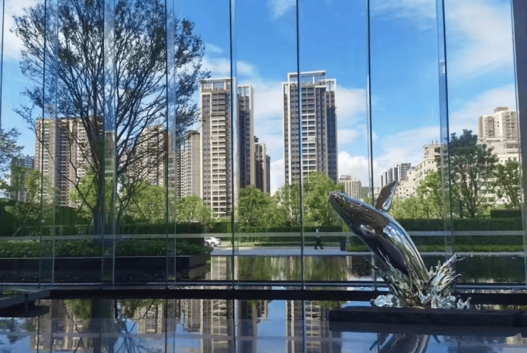 项目外立面:端庄简洁,线条感强且色彩统一,呈现自然极简的东方现代美感,选材方面以石材结合金属与玻璃,提炼深灰色、浅灰色和咖色作为主要色彩,塑造出隐奢典雅的封面形象。