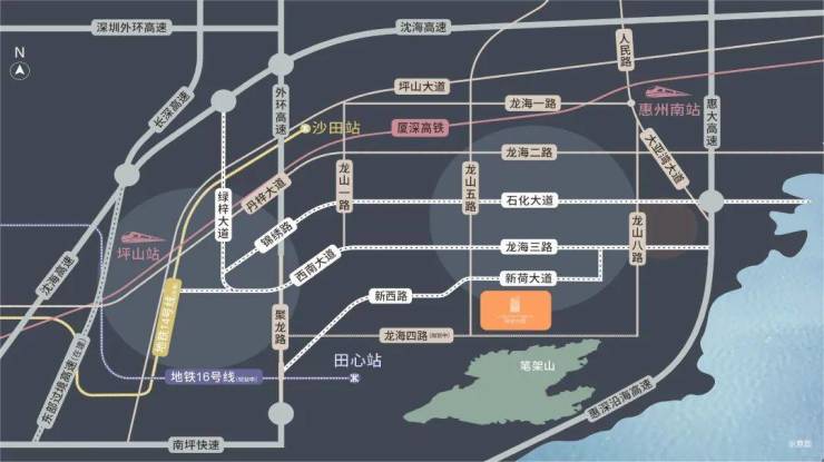 龙海四路:项目南侧主干道龙海四路(规划中),西起新兴一路,东至龙山三路。可快速直达深圳坪山。
