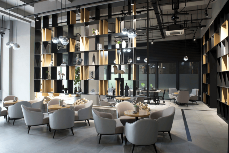 轻奢工业风大堂,书吧咖啡吧是打工人心灵休憩空间