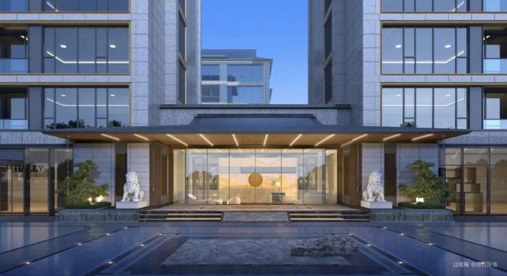 颂香望庐的建筑外立面沿袭传统宋式美学,采用四面铝板+三玻两腔玻璃立面,搭配爱马仕灰和蓝眼睛石材,古典但不失现代质感。