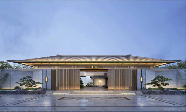 南大门搭配金属庑殿顶,庄重威严,与故宫体仁阁、北京皇史宬等历史名建形式相同。门楼延展面全长约48m,打造恢弘归家门仪。北大门敬呈“酒店式”落客体验,双大门设计,让仪式感和归属感相得益彰。