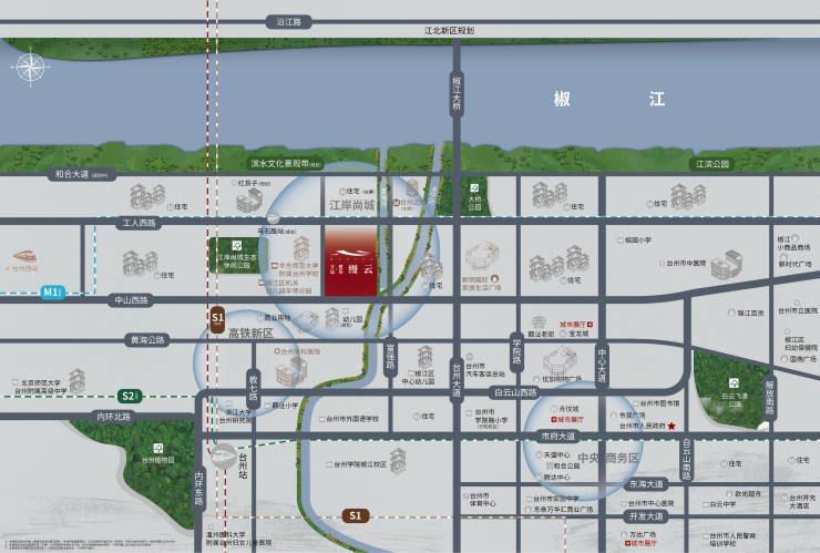 【生态】大桥公园、闸口公园、江岸尚城公园、滨江生态空间、台州大剧院(规划)