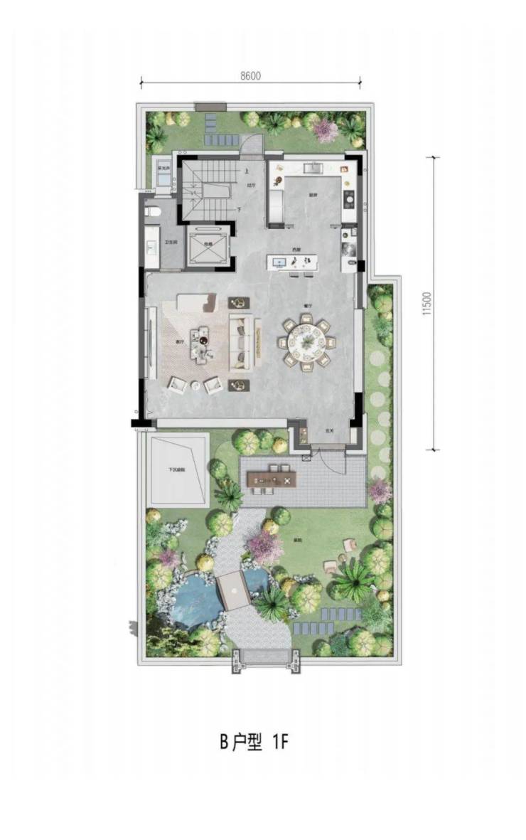 地下室也是这个项目的设计亮点,所有的建筑均配置了私家车库,南向设置了一个10㎡左右的下沉花园空间,大大提高了地下空间的通风、采光质量。