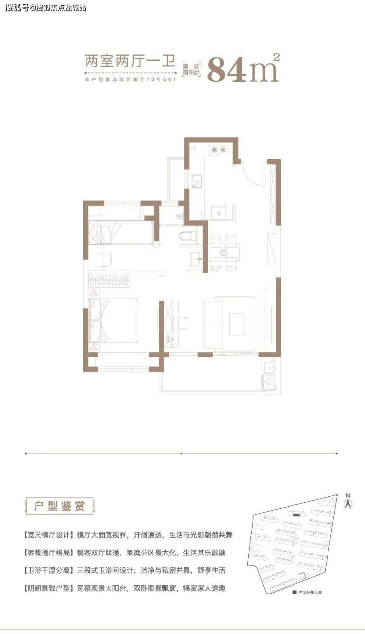 建面约84㎡2房2厅1卫户型,做到了2+1开间朝南+动静分离+卫生间干湿分离,非常紧凑的2房户型。