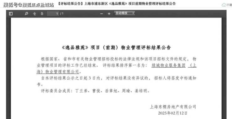 2025年2月绿城物业服务集团(上海)物业管理有限公司中标滨江一品苑前期物业项目,正式成为滨江一品苑物业。