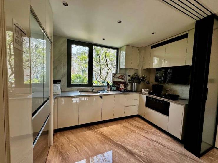 全套橱柜都是交付标准,就连餐边柜也是,并且全面采用定制橱柜,表面还使用了PET材料镀膜!