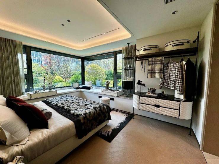 主卧约4.45米的进深,约3.4米的面宽,配合270°转角飘窗,实现无界视野和优异采光,躺在床上也能环幕赏景。
