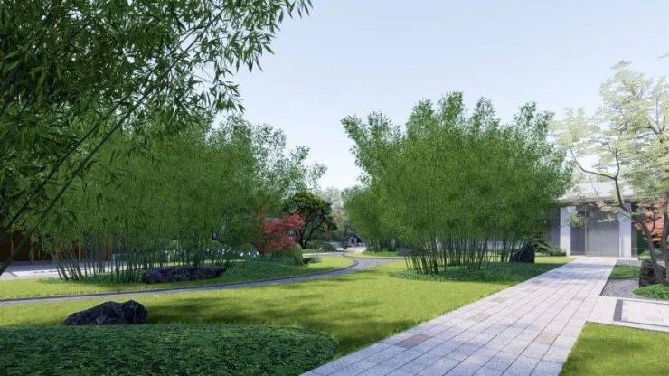 我们以板岩竖拼出一条流动的曲线,仿佛河流般流淌于林屿之中,并利用曲线流动产生的进退关系与行进的视线相呼应,配置竹林绿岛,在小空间中利用框景、障景、漏景等传统园林的设计手法进行设计,形成一幅幅具有现代江南园林感受的空间画面,使来访者在游园中感受惬意与惊喜。