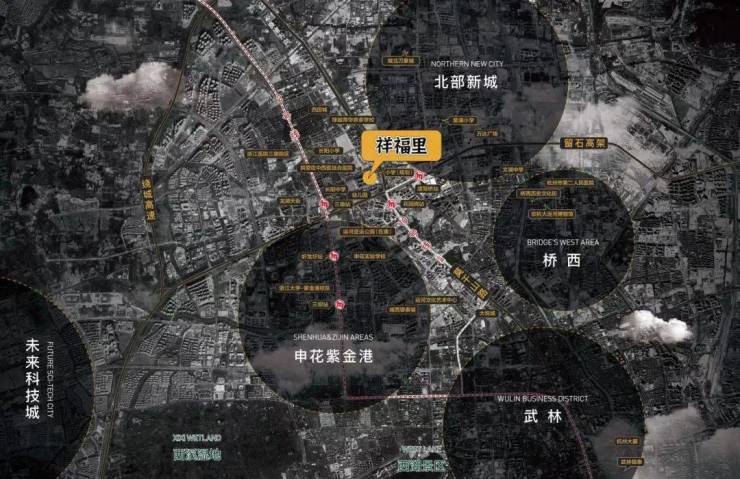 西侧1公里龙湖紫金天街、东侧1.5公里万达广场、北向3公里城北万象城、南向3公里大悦城、城西银泰城等多个繁华商圈。