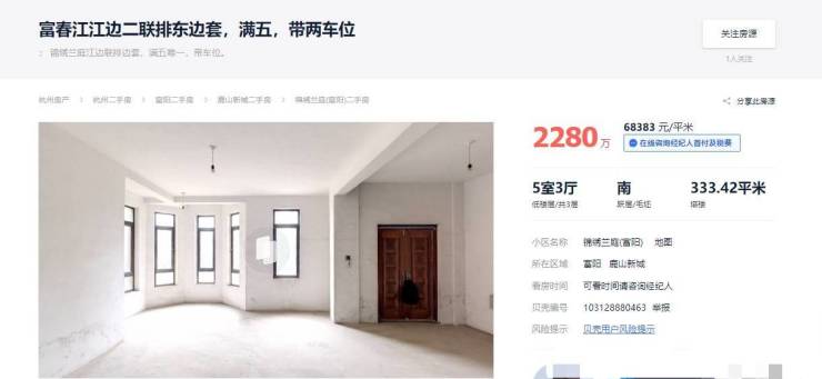 作为千年富阳的发展主场,这里荟萃富春江天然的优渥自然资源,东吴文化公园、富春山馆,深受杭州富人的喜爱,项目东侧400-600米,排屋项目:春江花园、山水华庭,总价2000-3000多万。项目东南侧1.2-1.7公里,鹿山时代、喜来登酒店边上的排屋:锦绣兰庭、隆和府、山水御园,排屋面积330方,总价2200-5000万,现在贝壳上330方毛坯单价6万8,总价2280万,320方单价10万8,总价3500万。