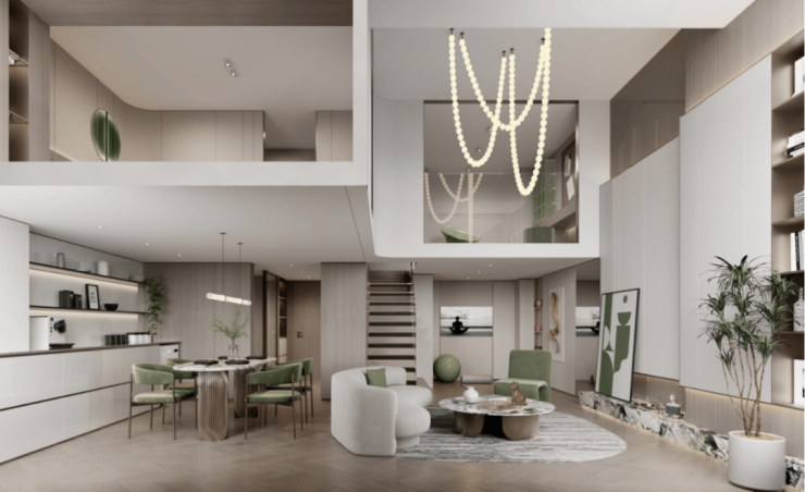 约4.5米挑高灵动格局,百变格局更随心建面约76㎡效果图示意,实际为毛坯交付,具体请以合同为准