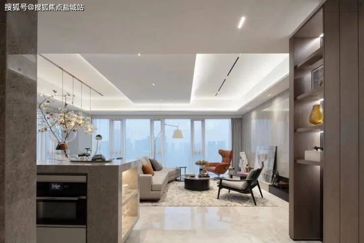 进入玄关,艺术玄关带来了画廊般的高洁品质。同时门口也藏有一个独立的家政空间,容纳了家庭日常洗衣和各类清洁需求。两面完整的落地玻璃幕墙,为客厅引入了绝佳的采光,在阳光照洒进室内时,带来一种超越语言的纯粹感。