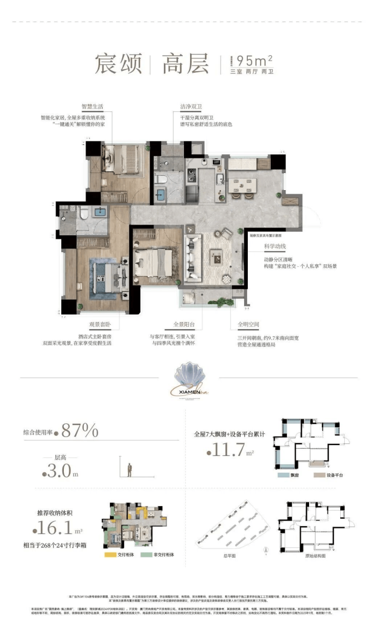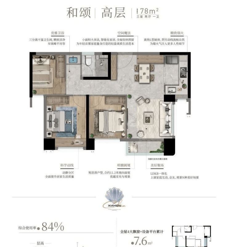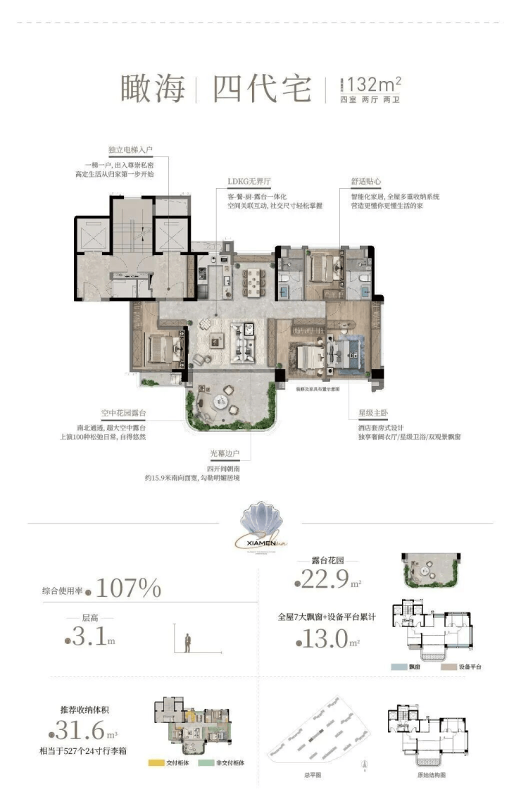 作为会展新城首个四代宅项目,海上雅颂主推78-132㎡三至四房,覆盖刚需、改善需求,整体得房率约84-107%。其中,高层层高约3米,四代宅层高约3.1米,整个空间感会更通透。