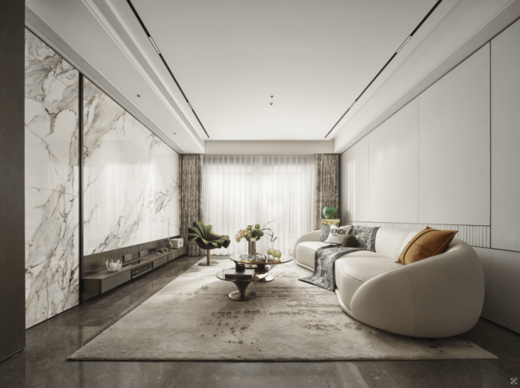 客厅面宽达到约4.2m,空间感和舒适度拉高了一个档次。项目还创新性采用"岩板隐形门"设计,将次卧入口完美融入电视背景墙,呈现极简主义的空间美学。